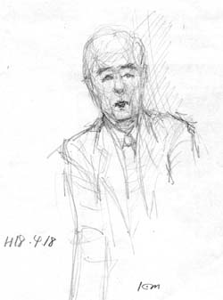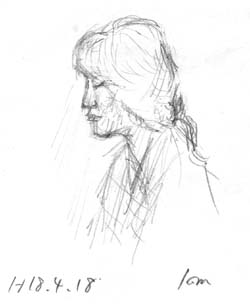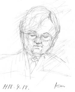 | 報告会終了の後で、「はい、これ」と渡されてイラストされていたことを知ります。 今日などは、解説を聞くことにのめり込んでいたので、一体どんな表情だったのか。 顔をしかめたり、考えこんだり、そういう中の瞬間をとらえてもらったイラストです。 解説をしていただいてやっと、さっきの裁判長の言葉を改めてかみしめているので、 他は何も頭に入りません。学生の状態に戻る時です。 |