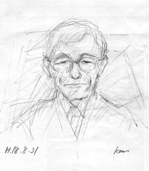 | 今回から左陪席の方が替わられました。裁判自体が短時間でしたのでイラスト担当者は大慌てになりました。悲鳴のような伝言がありました。「デッサン中の線がたくさん残っています、雰囲気をお伝えする途中でした、決してしわではありません」 |