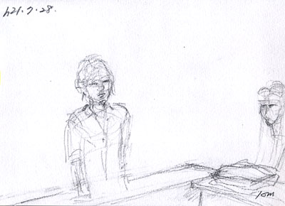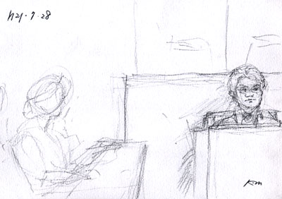 (イラスト担当者は、思わず判決に聞き入りました。手は完全に止まったと言います。とんでもない役目をすみません。判決聞きながら描くなんて神業です) ―判決は大きな声でゆっくり、そしてとてもはっきりした言い方で始まりました。初めて法律用語を聞く人達にも言葉はよく聞き取れたと思いました。 「1. 一審被告ニコンは、一審原告に対し、一審被告アテストと連帯して7058万9305円及びこれに対する平成11年3月6日から支払い済みまで年5分の割合による金員を支払え。」 ―金額を聞いて、勇士の減額がなくなり、父親の遺産相続放棄が認められたことを確信しました。でも。続く言葉の中に、 「・・一審原告の・・その余の請求をいずれも棄却する・・」が何度か出てきます。と・・いうことは・・?! すると。素晴らしい笑顔です!! 地裁判決の時は、3割悪いと言われて固まり、高裁の素晴らしい判決でもやっぱり固まりました。説明不能です。 【平林慶一 右陪席裁判官】 【小海隆則 左陪席裁判官】 【書記官】 |