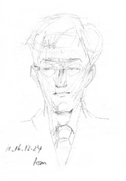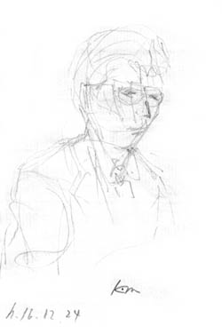 | 前回、最終弁論でご紹介出来なかった係の方です。今回は傍聴席に着くとすぐにイラスト開始をさせていただきました。 裁判の始まりに壇の下、左側から(傍聴席から見て)声かけをなさいます。 「ご起立願います」 「ただいまから、平成12年(ワ)14717号の審理に入ります」 とてもはっきりした声が響きます。 |