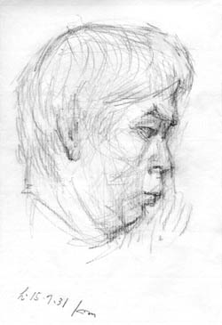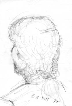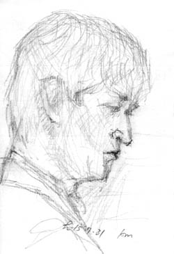 | 主尋問の様子を、原告側席から見守っていただきました。 前回のスケッチに当弁護士の掲載がなく、「どんな方」というメールが多くありました。 初めまして、この方が川人博弁護士です。 |